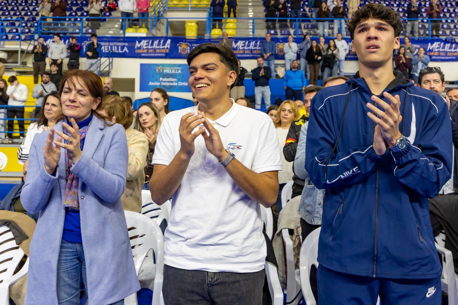 Durante la intervención del consejero de Deporte se vivió uno de los instantes más simbólicos del homenaje, con el despliegue de una lona con la imagen de Óscar Giménez Barrios que lucirá durante toda la temporada en el Pabellón Javier Imbroda, bajo el lema “Argentino de origen, melillense de corazón”, en reconocimiento permanente a su legado.